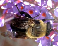 Some beetles try to resemble bees. Painted Locus Borers have black and yellow stripes, and they hang around on goldenrod, as bees do. But a closer look shows they have little in common with bees, other than color. Flying beetles have hardened, shell-like wings.